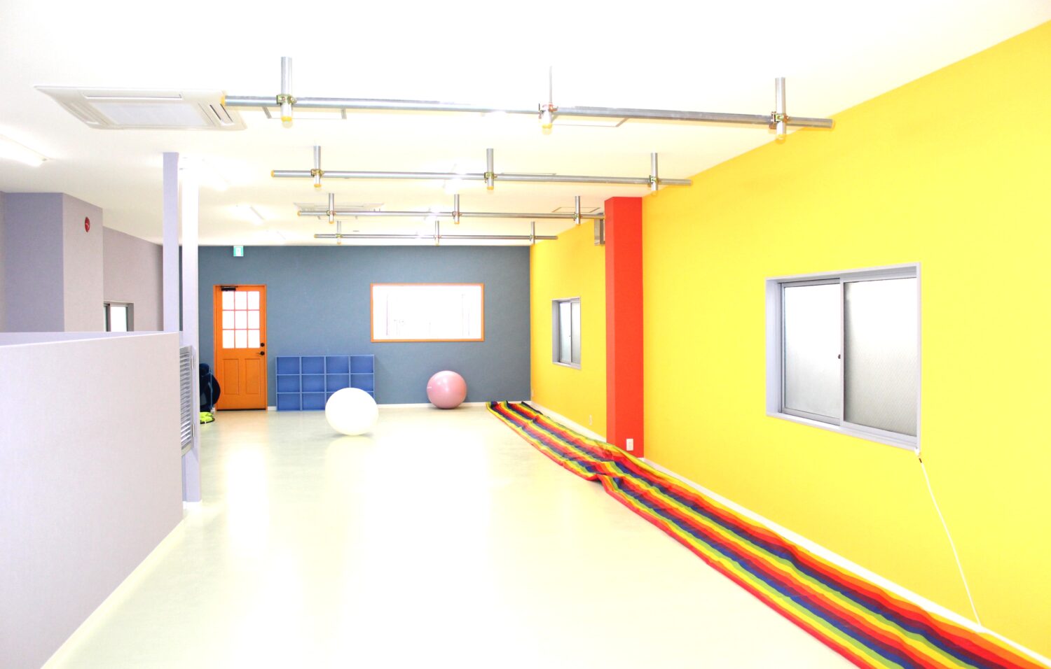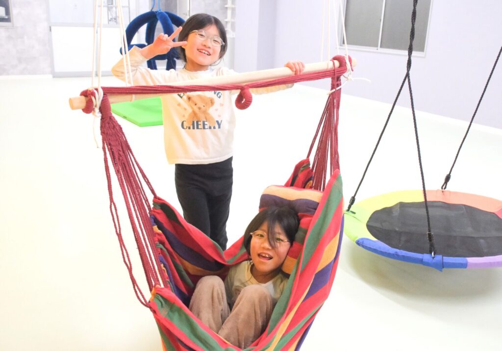 揺れる・回るなどの空中あそびを楽しめる設備を備えています。体を動かした後は落ち着いて過ごせる学習スペースを用意し、遊びと机上活動の切り替えを自然に行える環境にしています。活動の流れが整うことで、取り組みやすさへつなげます。